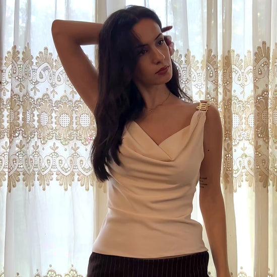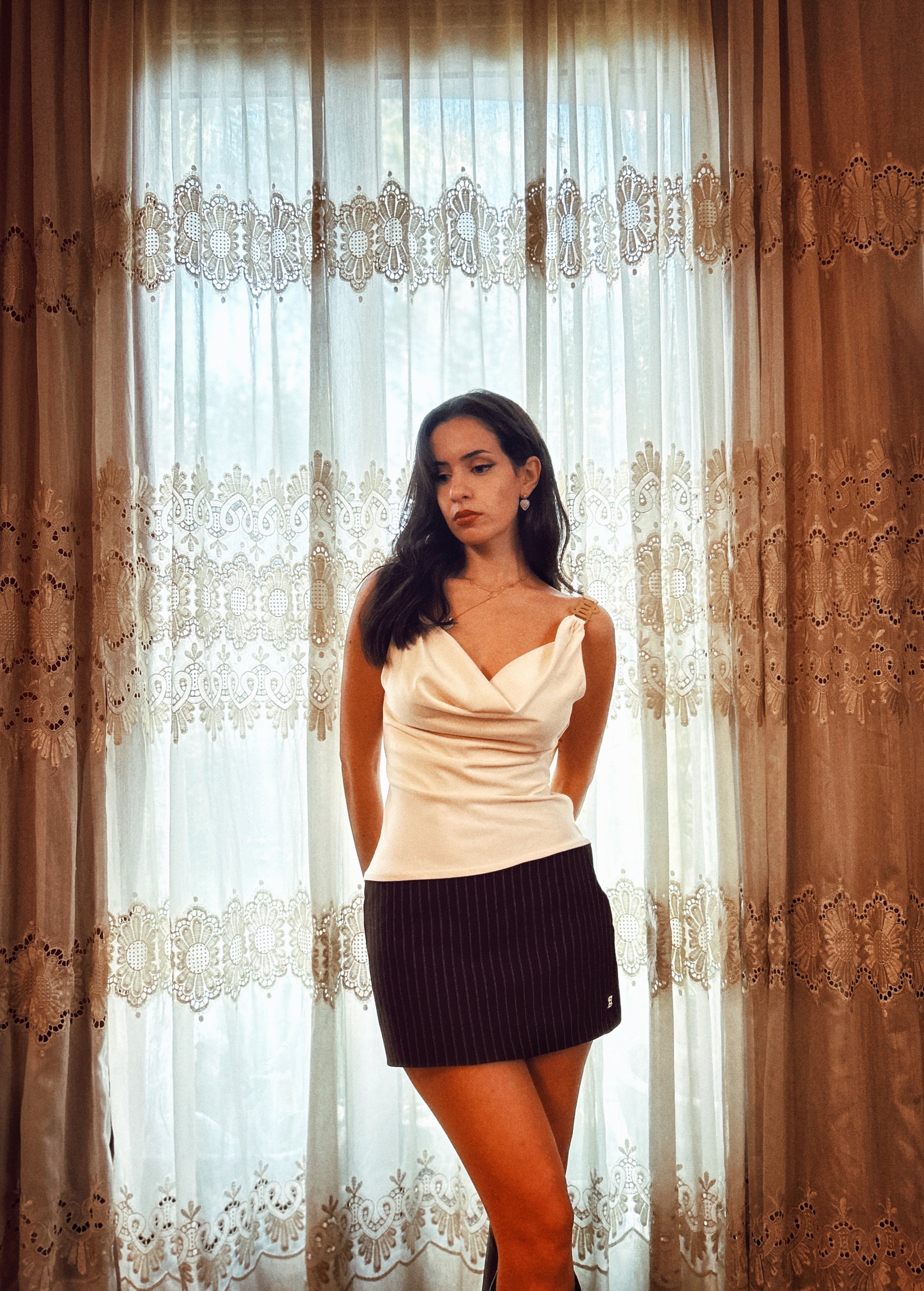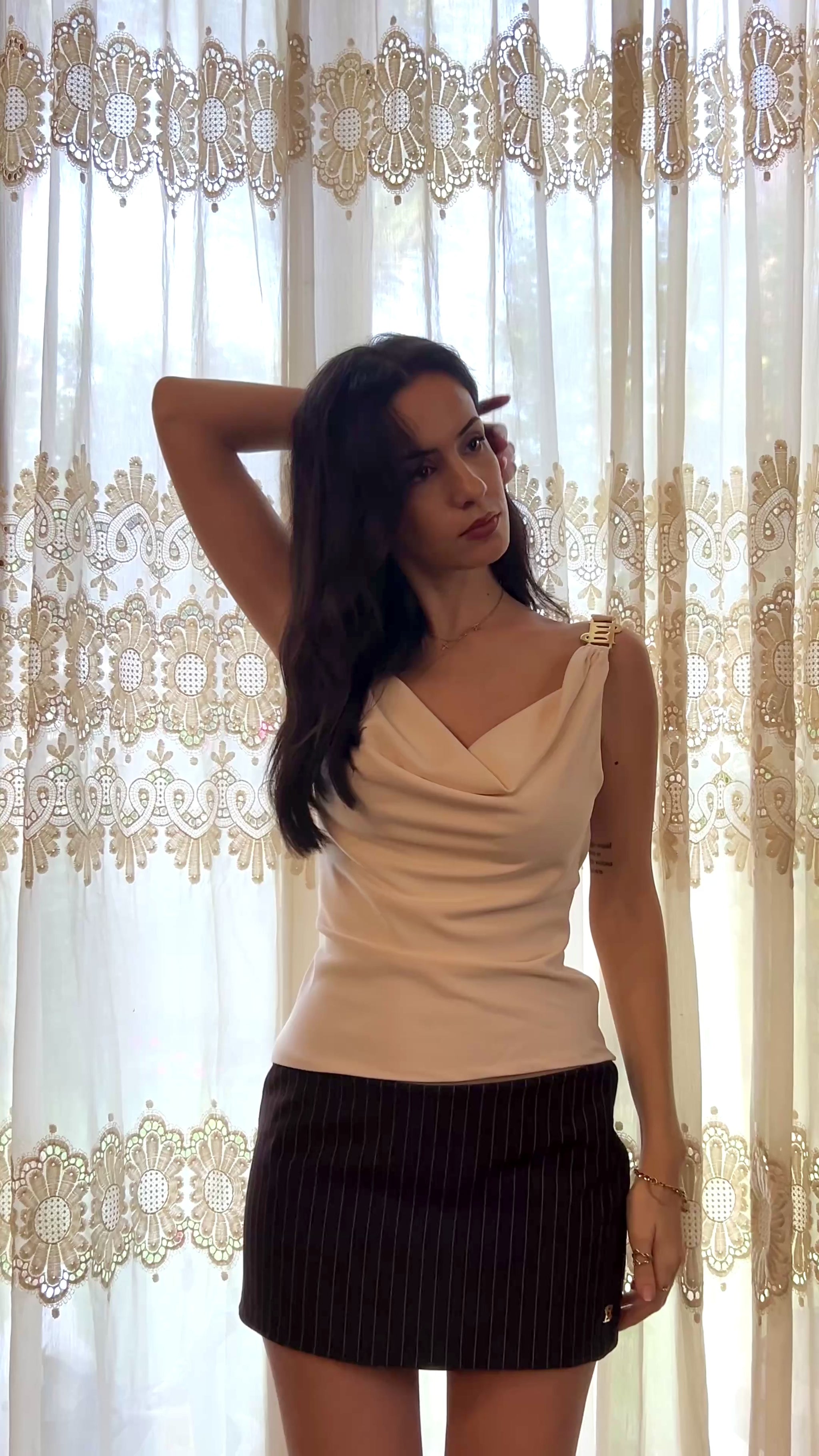 Introducing the FALL FOR ME skirt, a crepe low waisted mini skirt with our ETERNA DNA through the gold plated brass accessory. It is doubled with a satin lining.
