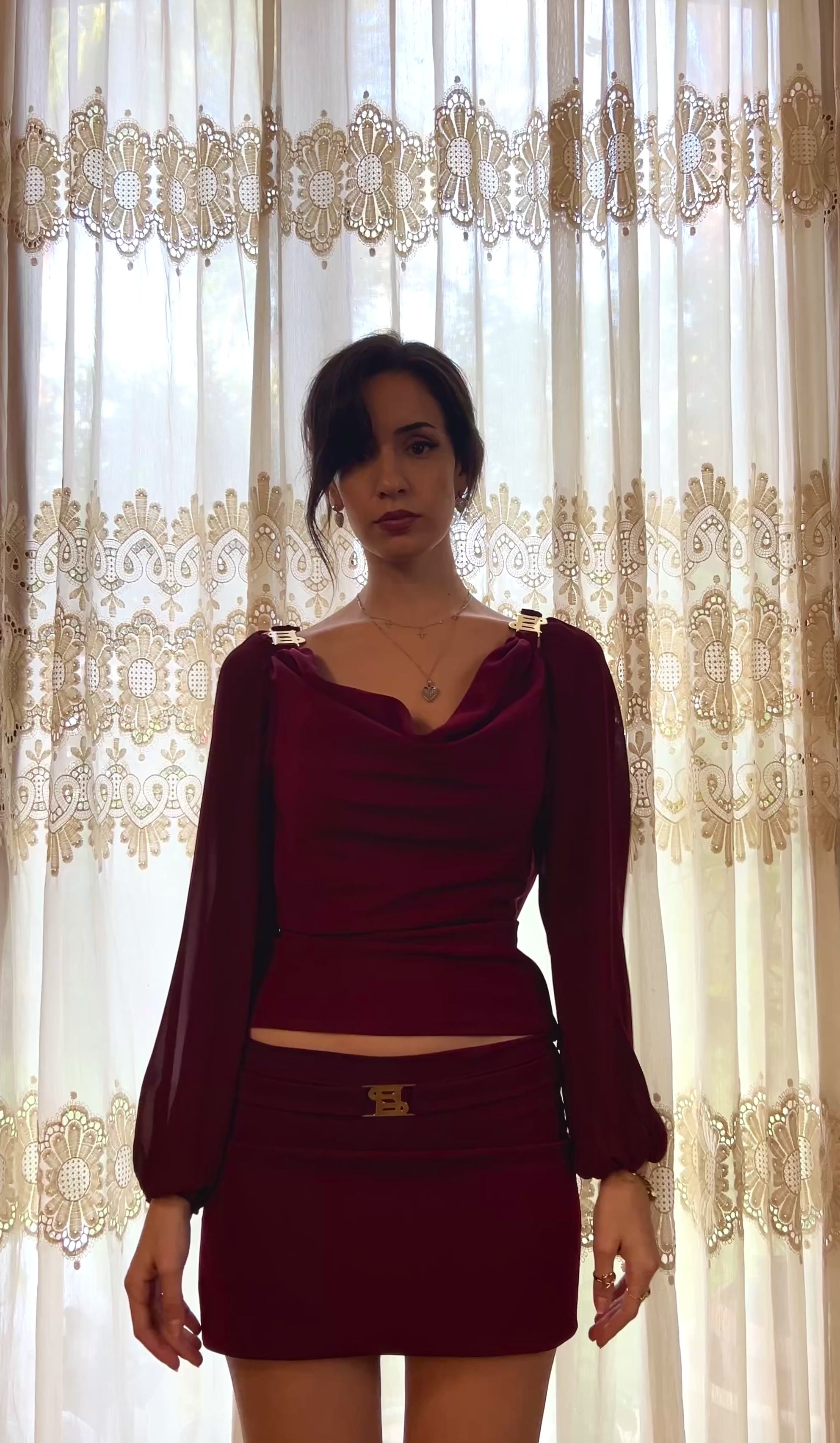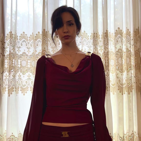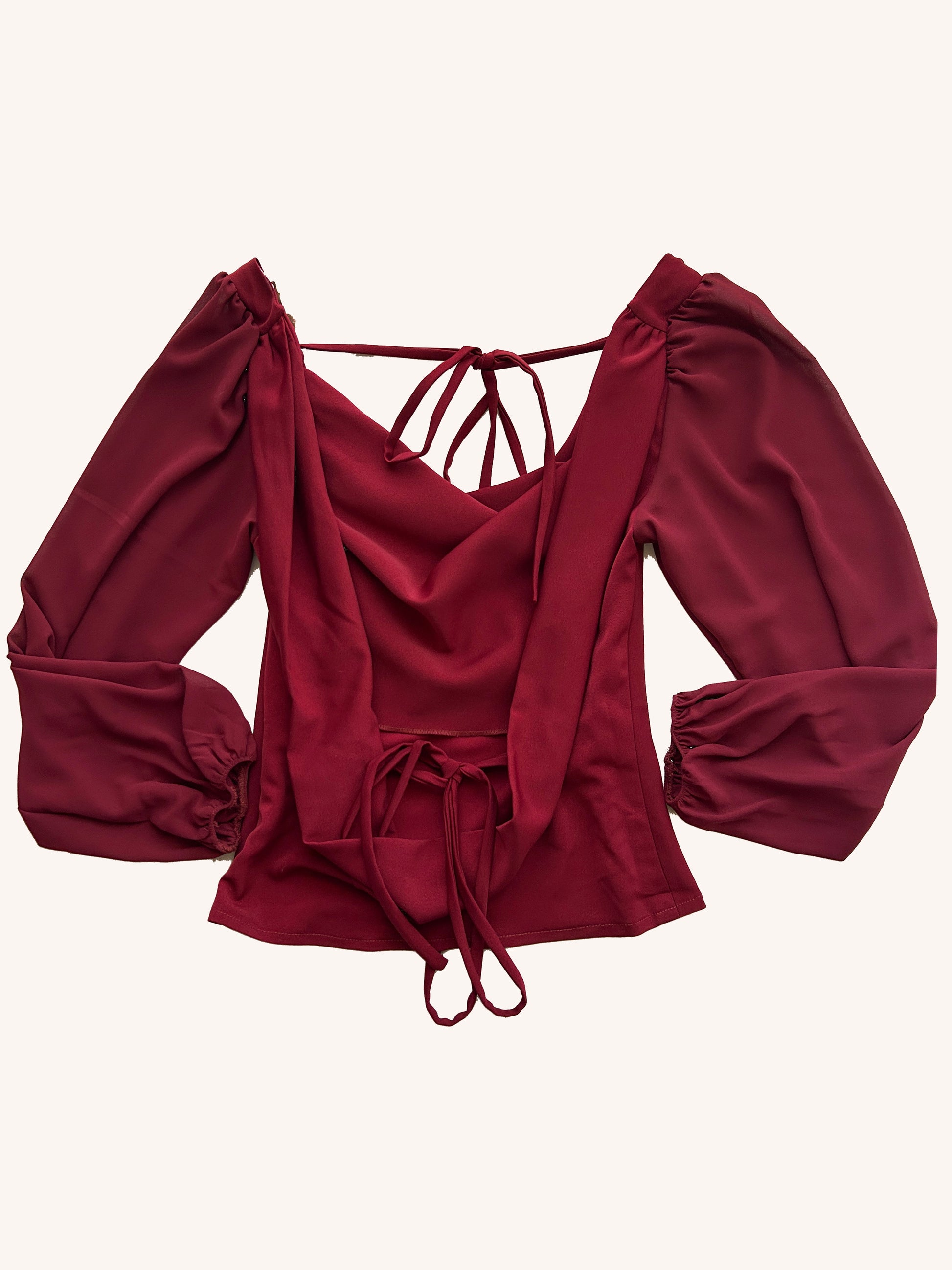 Introducing the ROMANTIQUE top, a crepe plunging back cowl top with long puffy chiffon sleeves, it can be worn in a numerous ways thanks to its functional ties on the shoulder level, and waist level. it allows it to be tightened and adjusted to your liking