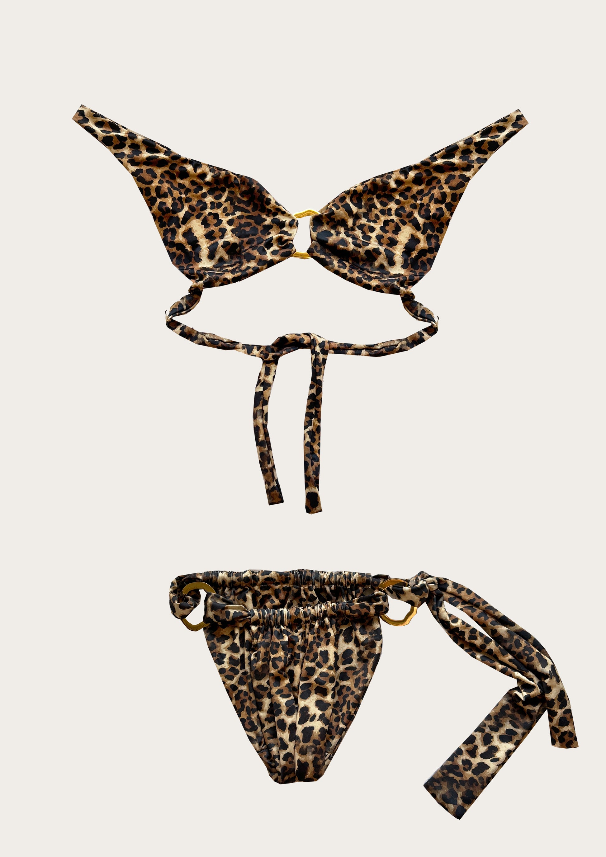 The PAMELA Bottoms are ruched side tie bottoms with one thick strings tying the front and back with our irregular gold plated brass accessory on each side. Could be worn at a high or low waisted level. Full back coverage, could also be shrunk and adjusted to your liking